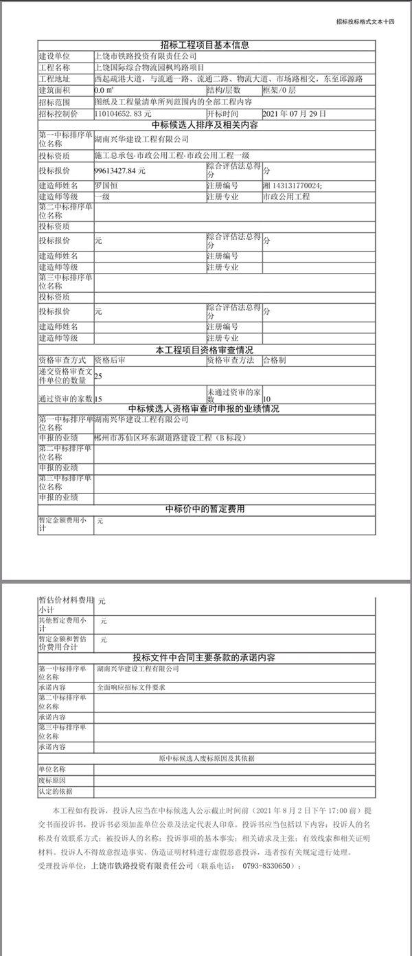 上饒國際綜合物流園楓塢路項目中標候選人公示