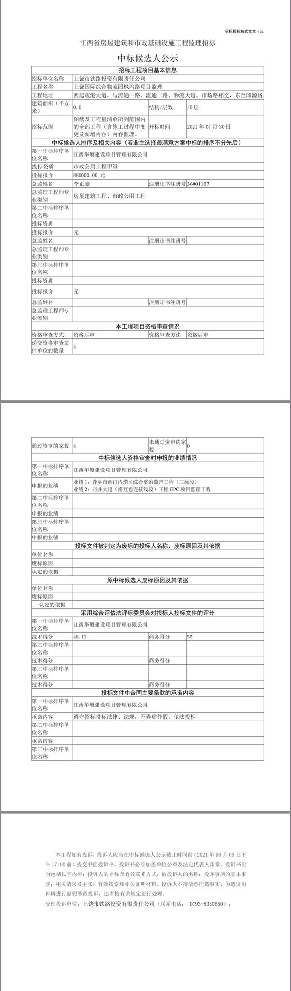 上饒國際綜合物流園楓塢路項(xiàng)目監(jiān)理中標(biāo)候選人公示