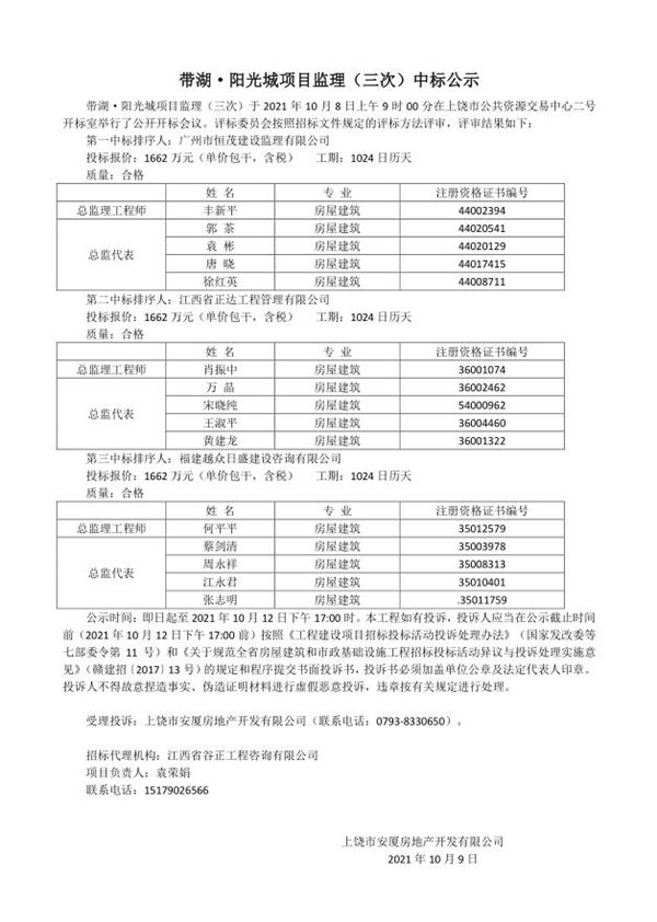 帶湖·陽(yáng)光城項(xiàng)目監(jiān)理(三次)中標(biāo)公示