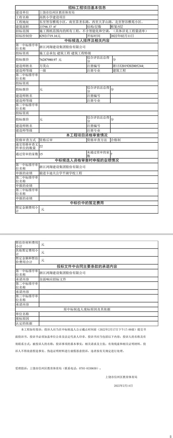 高鐵小學(xué)建設(shè)項(xiàng)目中標(biāo)候選人公示
