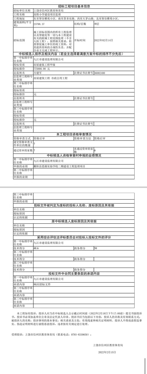 高鐵小學(xué)建設(shè)項(xiàng)目監(jiān)理中標(biāo)公示
